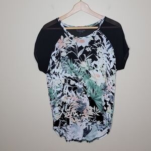I Jeans by Buffalo | Tropical Floral Print Short Sleeve Top with Mesh Upper.