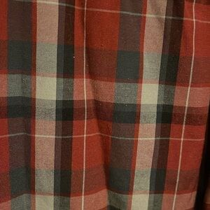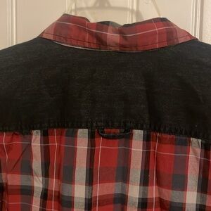 I Jeans by Buffalo. men’s XL LONG & short sleeve western button up shirt, two front pockets with buttons, black accent on both shoulders & black elbow pads . The sleeves can be converted into short sleeves with buttonloop . This is new without tags. Red, black & gray plaid. Raw edge inside lower edge by button as shown in picture. Shacket
