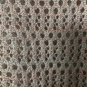 It features a round neckline, open weave design, long sleeves, and silver threading throughout. 51% viscose/30% cotton/13% polyester/6% metallic. In excellent pre-owned condition.