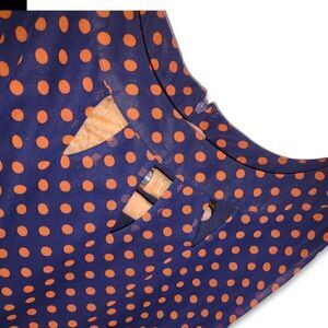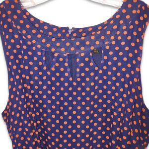 ILE New York Navy polka dot Dress Red Orange dots Sleeveless Scoop Neck with cut outs. Chiffon with Blue Lining Knee Length. Fit and Flare, attachment Belt .