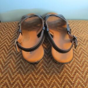 Black leather top-stitched weave style sandal with stacked formed heels. Very nice looking shoe that is (obviously) known for their comfort. The soles look pristine, the insoles show slight signs of wear, so apparently worn only a time or two. They are ready to roll!