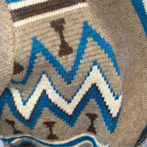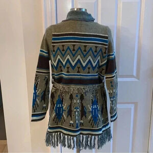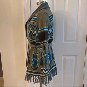 I LOVE H81 Cardigan Sweater Open Front Fringe Tribal Print Brown Blue Size Small