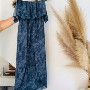 I LOVE JOAH Blue White Printed Off Shoulder Ruffle Tube Top Slit Maxi Dress M