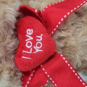 Cute little teddy bear wearing a red ribbon and red heart that says I LOVE YOU
