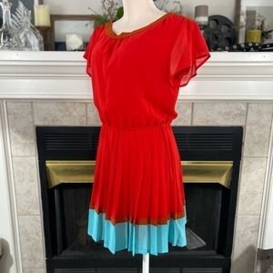 I Love H81 Red Pleated Dress with Turquoise Hem and Elastic Waist.