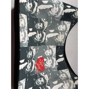 The "I Love Lucy Black Handbag Purse- Style #2023 Lucy & Ethel" is a vintage-inspired shoulder bag made from black and white canvas with a red gingham lining. It features a zip closure, silver and black hardware accents, and inner pockets for organization. The bag has a small size with dimensions of about 9 inches in width, 6 inches in height, and 4 inches in depth. The exterior design includes a heart and heart Lucy and Ethel character accents, making it a unique and stylish accessory for women who appreciate the classic "I Love Lucy" theme.
