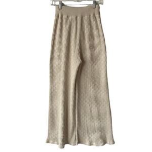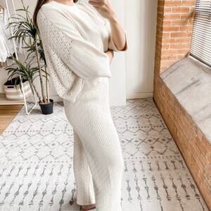 I Love Mr. Mittens Sweater Pant Matching Set in Cream. Features crew neck, short sleeves, dropped shoulders, semi cropped length, pullover style, cable knit ribbed, high waist / hi rise, relaxed wide legs. 100% cotton. Great used condition, no notable flaws.