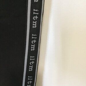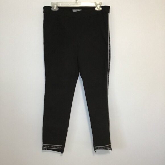 Comfortable and stylish, black skinny, pull-on pants. Feature a logoed tuxedo stripe along outer leg and along split, high/low hem.