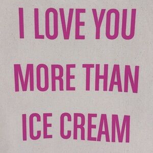 Midweight 100% cotton canvas tote in natural cream with hot pink lettering that reads: “I Love You More Than Ice Cream” on the front, blank on the back