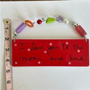 Ceramic hanging piece with the words "I love you to the moon and back" on the front. Just simply hang it on a small nail. Hanging wire is strung with beads. The piece is 7" wide and 4.5" high (including hanging wire). See pictures. Perfect gift for a cherished child, Mom, Sister, Brother etc. No chips, scratches. Perfect condition. Smoke free home.