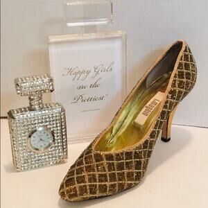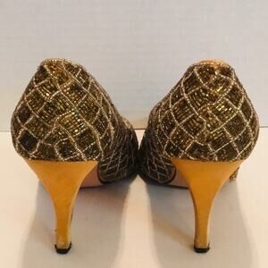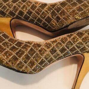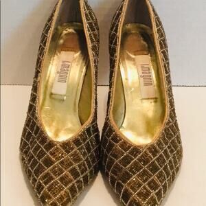 AH gold bugle beads- diamond shape edged teeny crystal clear beads. STUNNING. V neck throated silhouette. Very 70’s 3 3/4” slim gold heel.. slight nick on bottom of left heel, Some beads have shifted few missing from bottom areas.. SIZE 9.5