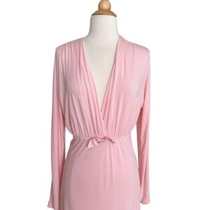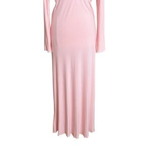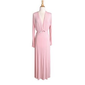 70s loungewear, vintage hostess gown, soft pink long dress, plunging v-neckline, long sleeve dress, glam vintage nightgown, romantic eveningwear, retro lounge dress, vintage glam chic, pajamas, pajama dress