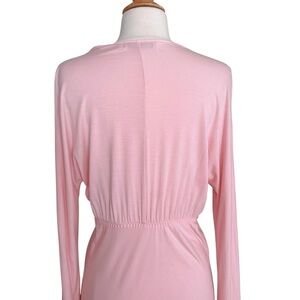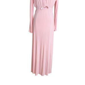 This is an elegant vintage I. Magnin blush pink maxi dress, dating to the late 1970s to early 1980s, made in Hong Kong. Featuring a plunging surplice V-neckline, long sleeves, and an elasticized waist with a delicate bow it’s the perfect blend of feminine and lounge-chic.