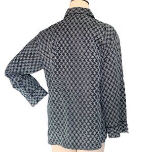This I. Magnin Cotton Button Down Pajama Style Top in size M features a black and white geometric pattern, collared neckline, long sleeves, and button closure. Made from 100% cotton, this relaxed fit top is machine washable and accented with piping details. Perfect for casual occasions, it offers a lightweight and breathable feel, making it suitable for all seasons. With a vintage style and 80s hipster look, this oversized and classic button-up is a versatile wardrobe staple for any fashion-forward woman.