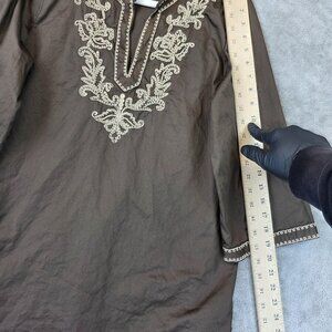 I. Magnin Shirt Womens Medium Brown Embroidered Tunic Boho 3/4 Sleeve Split Neck