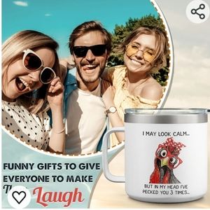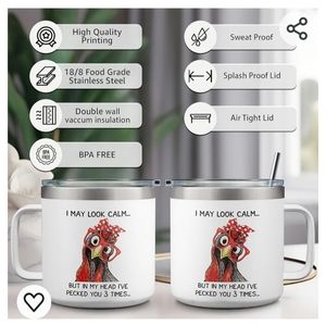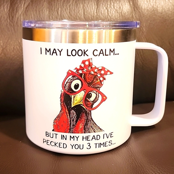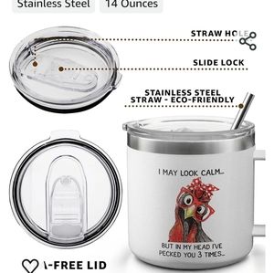 I May Look Calm But in My Head I've Pecked You 3 Times Mug Chicken Coffee Cup. Material - Stainless Steel. Capacity - 14 Ounces. 🎁 UNIQUE GIFT FOR YOUR BELOVED ONES 🎁 Our funny Mug will certainly be the perfect gift to Mom Dad Grandparents Friend Bestie Sister Coworker Boss Colleague. Surprise them with the best Happy Birthday, Anniversary, Father's Day, Mother's Day, Thanksgiving, Christmas gifts to make them smile all the time. πŸ‘‰ PREMIUM MATERIAL - The mug body is made from 18/8 stainless steel with powder coating finish, durable, unbreakable, scratch-resistant, rust-resistant, and doesn't transfer the flavor of your drinks. Equipped with a clear BPA-free lid, good for health. The handle is thicker & comfortable grip. πŸ‘‰ TEMPERATURE RETENTION - Our 14oz Mug features the vacuum insulation tech that keeps beverage at the perfect temperature, hot or cold for a long time. Therefore, you can enjoy your favorite drinks anytime and anywhere. πŸ‘‰ SUITABLE FOR ANY OCCASION: Perfect for home, office, gym, travel, road trip, camping. Ideal for beach outings, pool parties or picnics. πŸ’Œ PACKAGE: Including 01 Stainless steel Mug + 01 Straw + 01 Straw Cleaner.