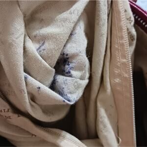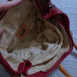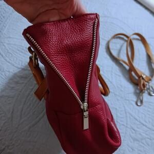 Beautiful leather purse in good preowned condition. These are super quality purses that really last. Cranberry red soft pebbled leather. Unzip at sides to make bag larger. Very roomy! All zippers work properly. There are ink stains in the large zipper middle pocket. Some rubbing on a couple of the corners, and the chrome rings are not super shiny anymore. But overall in beautiful condition. Photos show accurate condition and measurements. Besides the large zipper interior pocket there are two slip pockets and a smaller zipper pocket.