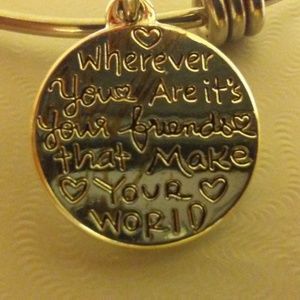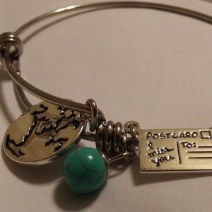 "I Miss You" Postcard with Turquoise bead, and map that reads "Wherever You Are, It's Your Friends That Make Your World" securely attached on a Silver Plated Wire Bangle Bracelet. Adjustable and Expandable One Size Fits All.