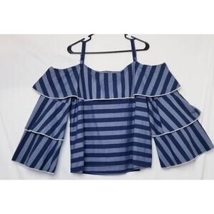 I.N.C. International Concepts Off The Shoulder Blue Striped White Trim Blouse; Size XL; Material - 100% Cotton; Care - Machine Wash Cold, Tumble Dry Low; Made in India; Adjustable Straps, Tiered Sleeves Off Shoulder, This blouse features a striped pattern, long sleeves with a cold shoulder design, and a flattering off-the-shoulder neckline with ruffle accents. The pullover closure and woven fabric make it easy to care for, while the regular fit and tunic style offer comfort and sophistication. Suitable for travel, parties, or casual outings.