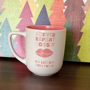 Gorgeous finely finished ceramic mug with pastel pink interior and cream exterior. Featuring playful text (I NEVER REPEAT GOSSIP SO LISTEN CAREFULLY) and pink lips design. Cute friendship mug to own and share.