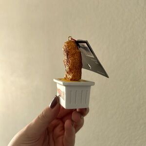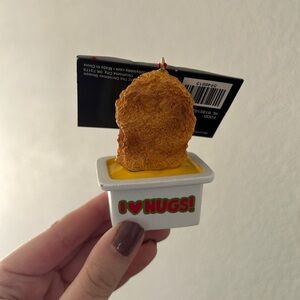 Add a crispy touch to your holiday tree with the “I ♥ Nugs!” ornament! Featuring a realistic golden nugget dipped in sauce, this quirky decoration is perfect for fast-food fans and fun collectors. The ornament measures approximately 3.5” tall and has a small mark on the base, adding a unique touch to its charm.
