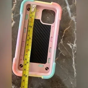 See dimensions in pictures. New. Very pretty colors and heavy duty case. Markill. Has ring stand. Military grade shockproof with magnetic car mount. Color Rainbow Pink