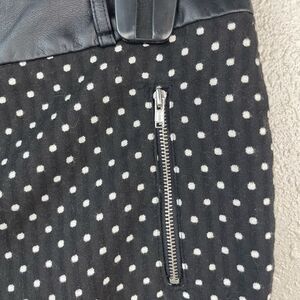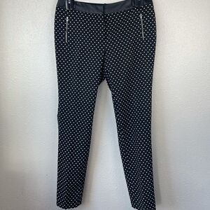 Super cute pair of polka dot pants featuring zipper front pockets and a faux black leather trim at the waist. They measure 17 inches at the waist and with a 30 inch inseam.
