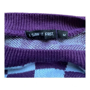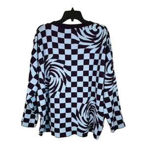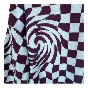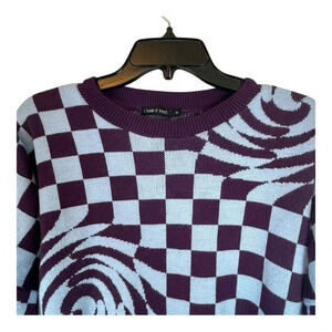 Abstract Checkered Optical Illusion Sweater by I Saw It First, oversized, purple and light blue print, checks and swirls, men or woman, unisex, size medium.
