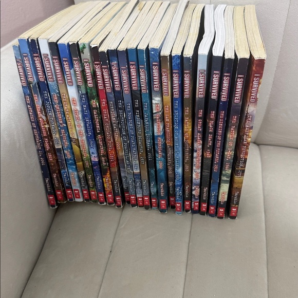 Collection of I Survived books with colorful spines. Perfect for fans of thrilling stories.