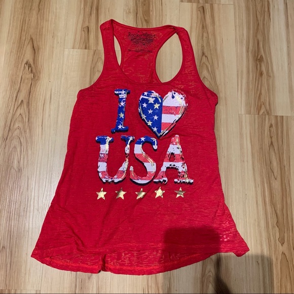 This I ❤️ USA Razorback tank is in good used condition. This tank is a little see through. The graphic represents the traditional American flag and also features gold accents. The tank does have some pilling pictured. No other noticeable holes or stains. Feel free to comment with questions.