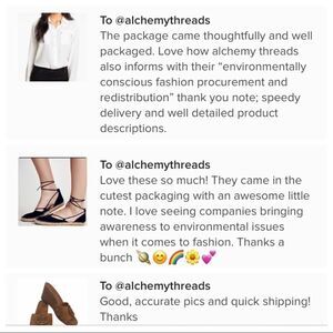 Shop my closet with confidence! Combating the environmental impacts of fashion is important to me. Not only will you get a great deal on a new to you item, I use Eco Enclose recyclable poly bags to keep your garments safe, 100% recycled & dye free tissue paper, & recyclable boxes or re-use packaging from my own purchases.