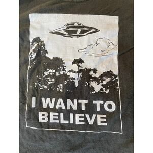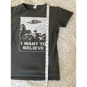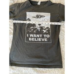 Faded black graphic tee featuring “I Want To Believe” UFO design — inspired by The X-Files.