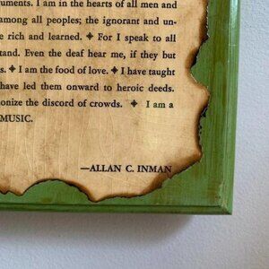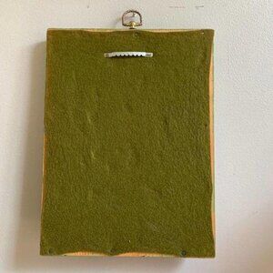 Cool unique piece, appears to be handmade. I’m guessing 1970s just based off the avocado green paint. There is cracking that can be seen in the clear coating over the print, adds to the charm! Solid painted wood. Measures 12 x 9.”