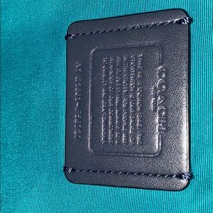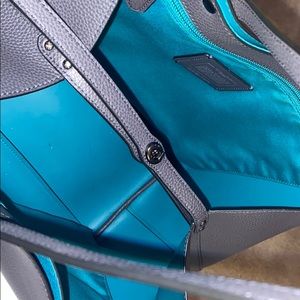This is a real leather coach bag market tote that is blue.