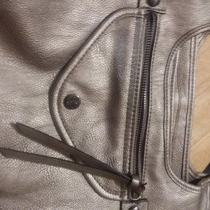 this is a vera wang faux leather shoulder pocketbook the color is silver. it is 11 inches deep. 15 inches length and 11 inches deep has pockets on the outside and inside. zipper style