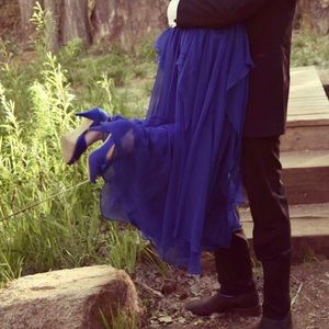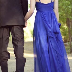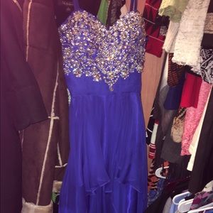 I've worn this dress twice. It's a great dress for prom or a pageant. It's royal blue and the top is completely filled with jewels.