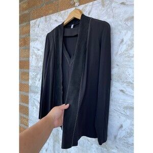 Top inside is missing the size label cardigan is a size large but runs like a medium, overall best fit a medium.stretchy material.