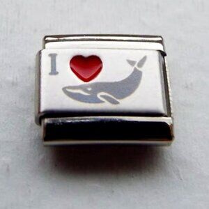 New never worn 9mm stainless steel Italian charm bracelet link with I red enamel heart and a whale lasered on it.Fits all standard 9mm Italian charm