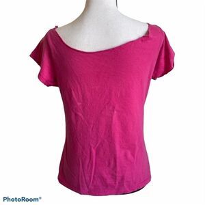 Features: Crop Tee Shirt in bright pink with graphic message. Shoulder is slouched shoulder styling. Hem is coming out of right sleeve. Check photos. There is no size tag so please check the measurements.