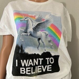 New with tags, I want to believe Unicorn shirt. Lightweight and comfortable this shirt can be unisex. 100% cotton. Box- B