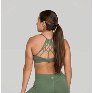 IAB MFG NWT 'Namaste' Strappy Sports Bra in 'Hunter' Green Size . New with tags. in excellent condition. Designed with fashion and function in mind, and taking inspiration from the intricate hand knotting techniques known as macrame and crochet, the "Namaste" Bra was created to support for all levels of training while stealing the show during any fitness endeavor.