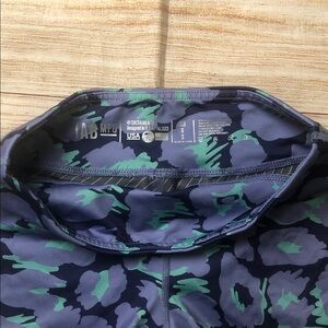 Stylish athletic shorts with a unique pattern. Features shades of blue and green. Elastic in legs to stop shorts from riding up.