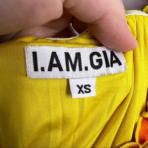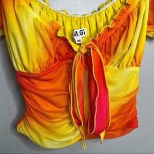 I.AM.GIA Yellow and Orange Mesh Tie Front Tie Dye Ruched Off The Shoulder Cropped Top. Hidden Zipper on the Side. Stretchy and Cute for Summer. Excellent Condition. No Flaws. Size XS. Bust-14” Length-12”