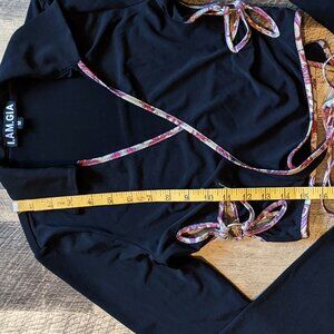 This is an I Am Gia Renalee top in Black. It is in excellent condition. It is a size medium, and the last three images show measurements. Cut-out flower designs on the sides, wrap front creates a v-neckline, spread collar, long sleeves, cropped length, stretchy polyester fabric, extended ties to wrap around the body.