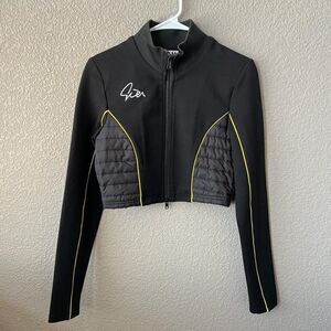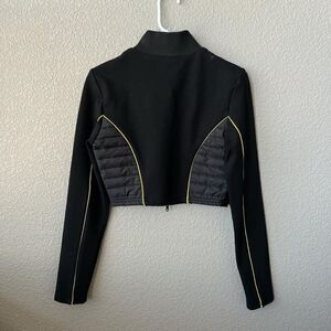 Size: Unknown, tag cut. Fits like a S. Measurements: Bust 17" Length 16.5" Condition: Excellent. Details: Long sleeve black cropped jacket, high neck with zip front closure, yellow piping detail, cropped hemline.