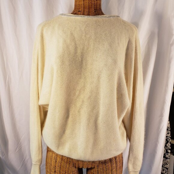 This stunning I.B. DIFFUSION women's white sweater is the perfect addition to any wardrobe. Crafted from a soft and luxurious blend of materials, this sweater is sure to keep you warm and comfortable all season long. The intricate diamond beading trimming the collar and deep V neck in the back adds a touch of elegance, making it perfect for a night out on the town or a special occasion. With its timeless design and quality construction, this sweater is sure to become a favorite for years to come.
