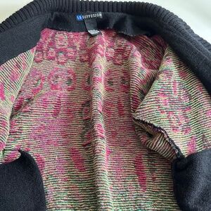 IB Diffusion cardigan sweater, beautiful pattern, vibrant colors, oversized, perfect 1980s. Looks great worn open or closed. Wool blend, pockets, no size label I'm a medium and it fits perfectly. Shawl collar, 3 button front closure, they are shiny and new looking. Condition looks great with nothing to note and it just came from the cleaners. Shown on a size 6 mannequin measurements approximately 50" chest, 40" hip, 26" length