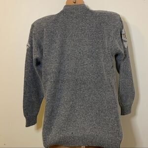 Description: Gently worn. Unique! Ribbed mock turtle neck. Long sleeves. Front embellished with tonal, black, silver, and coppery gold applique and beads. Ribbed sleeves and ribbed hip length hemline.