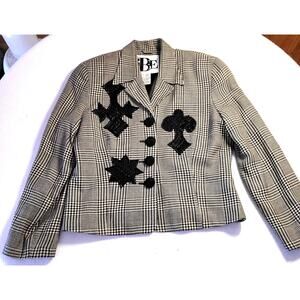 IBE Womens Blazer Jacket 10 Vintage 90s Y2K Silk Wool Blend Houndstooth Black Tan Y2K. Embellished beaded abstract shapes. Lined, Thin Shoulder Pads. No Pockets. EUC. Some minor fabric bumps or loose threads mostly on back.