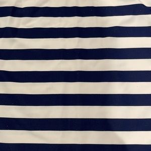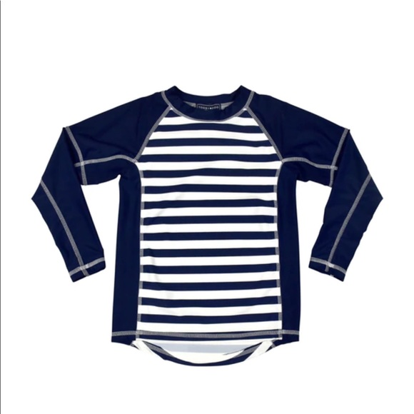 Long sleeve rash guard top with UPF broad spectrum sun protection. Quick drying, lightweight and breathable. High collars for added delicate neck sun protection. Navy blue and white stripe body with solid navy blue arms. Small rubber, sophisticated Toobydoo logo on back. I